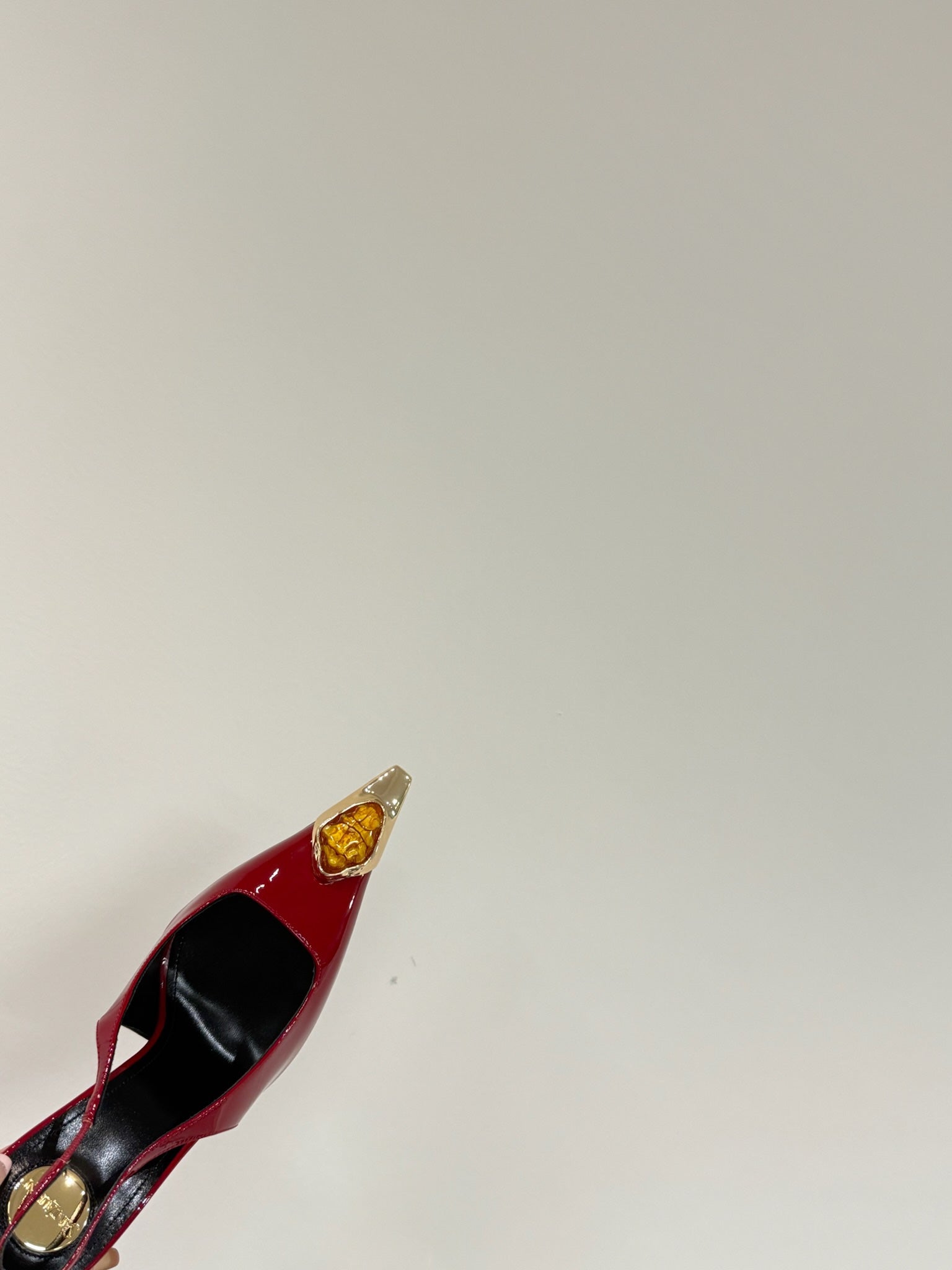 ORANGE GEM-STUDDED SLINGBACK PUMPS IN RED PATENT CALFSKIN