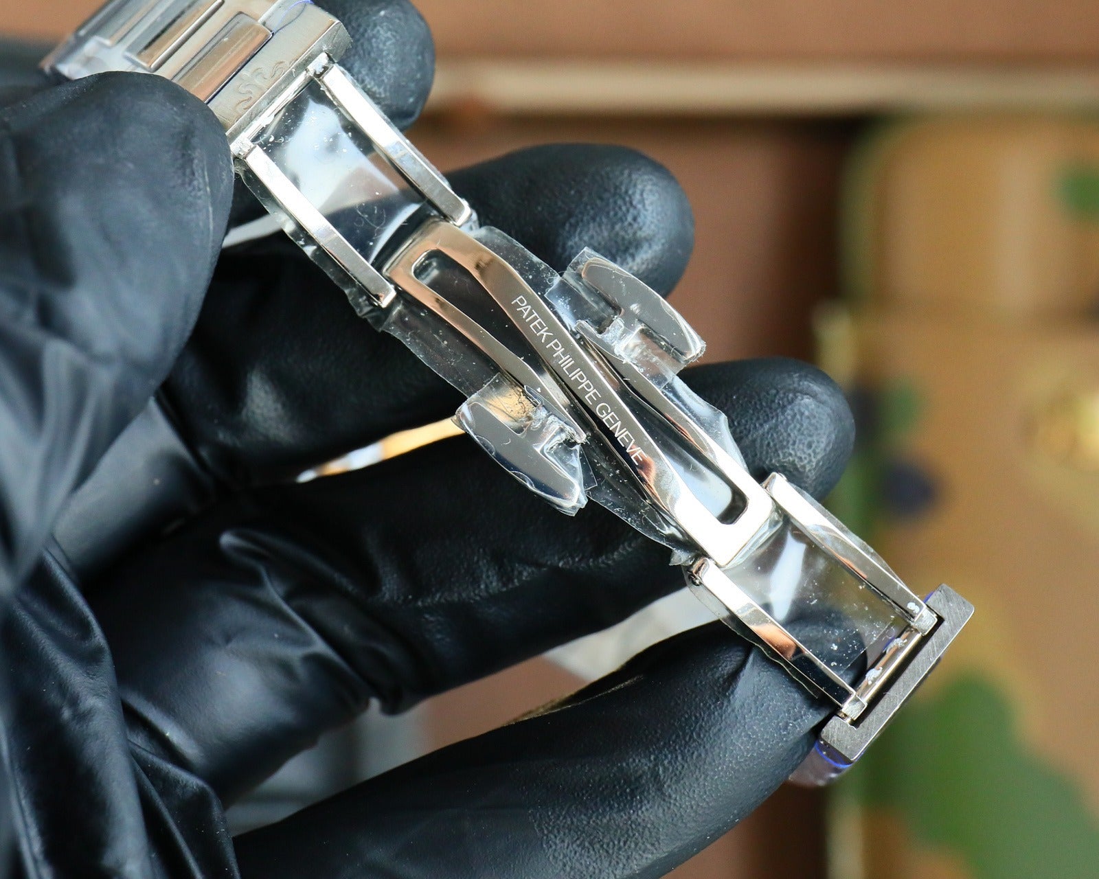 Integrated Bracelet & Secure Clasp: The finely crafted integrated stainless steel bracelet ensures a comfortable and secure fit, closing with a discreet butterfly deployment clasp featuring "PATEK PHILIPPE GENEVE" engraving.