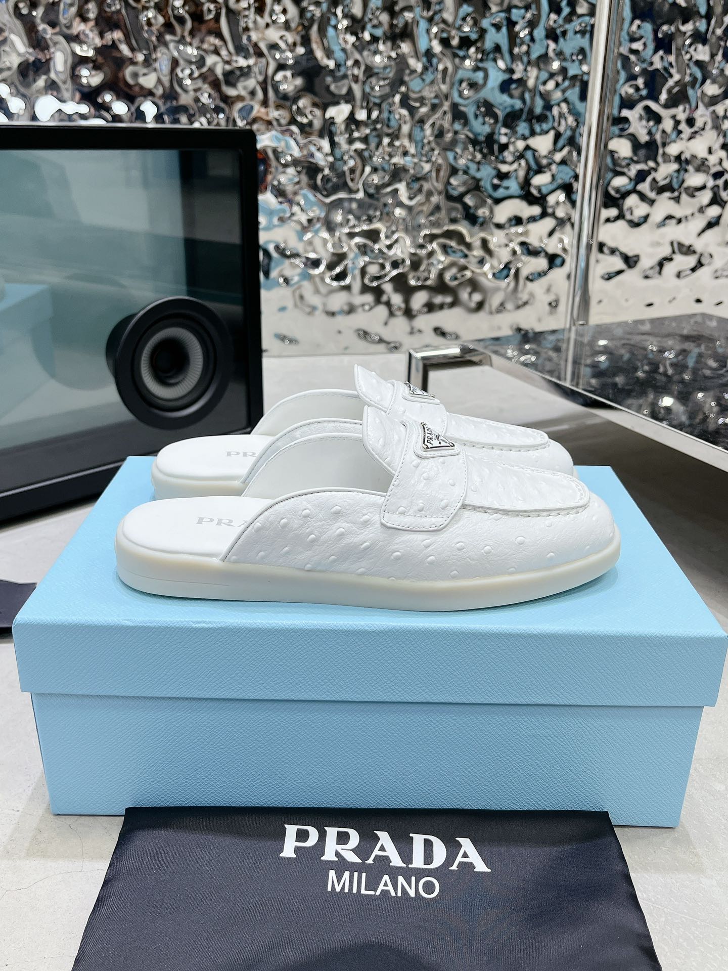 PRA OSTRICH PATTERN MULES WHITE CALFSKIN