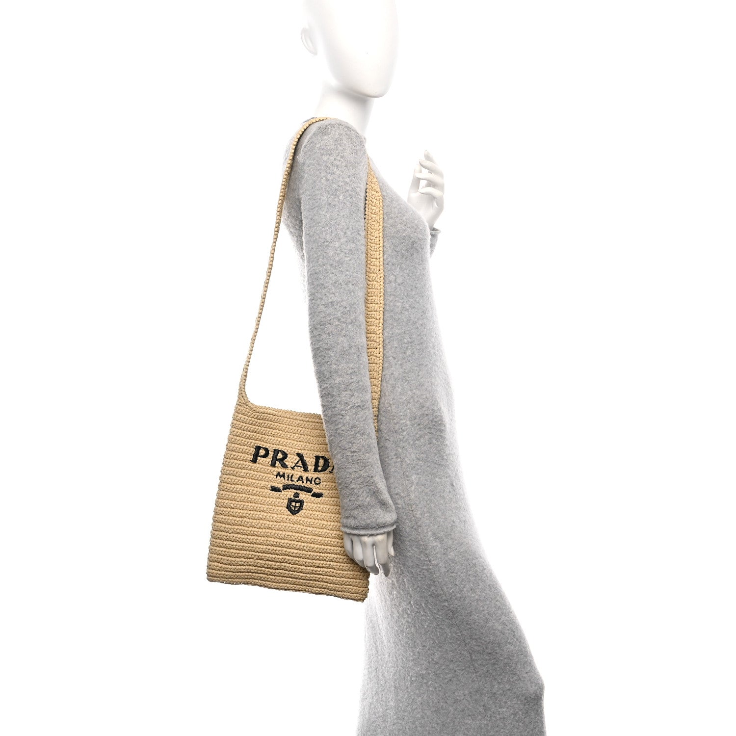 Yarn Raffia Effect Crochet Embroidered Logo Tote Messenger Bag Naturale