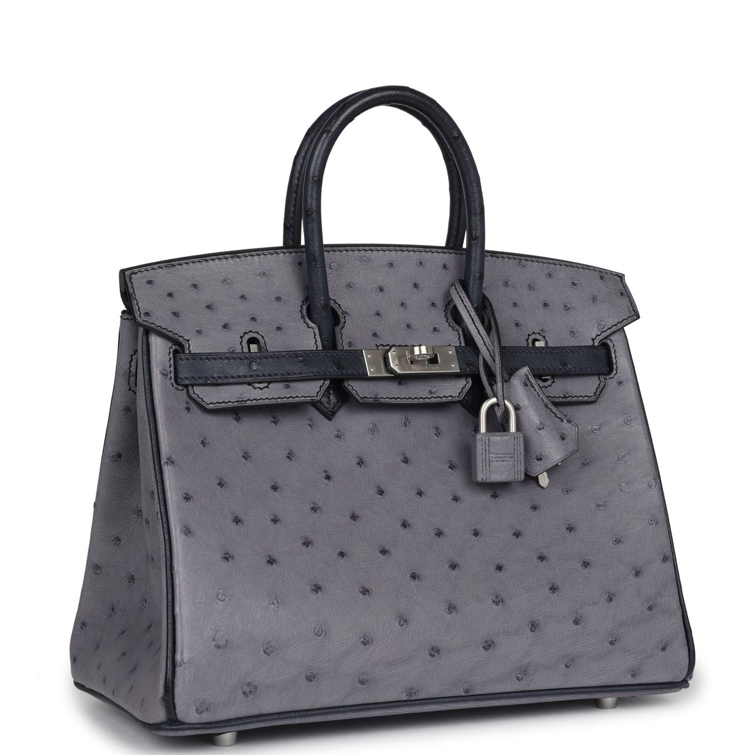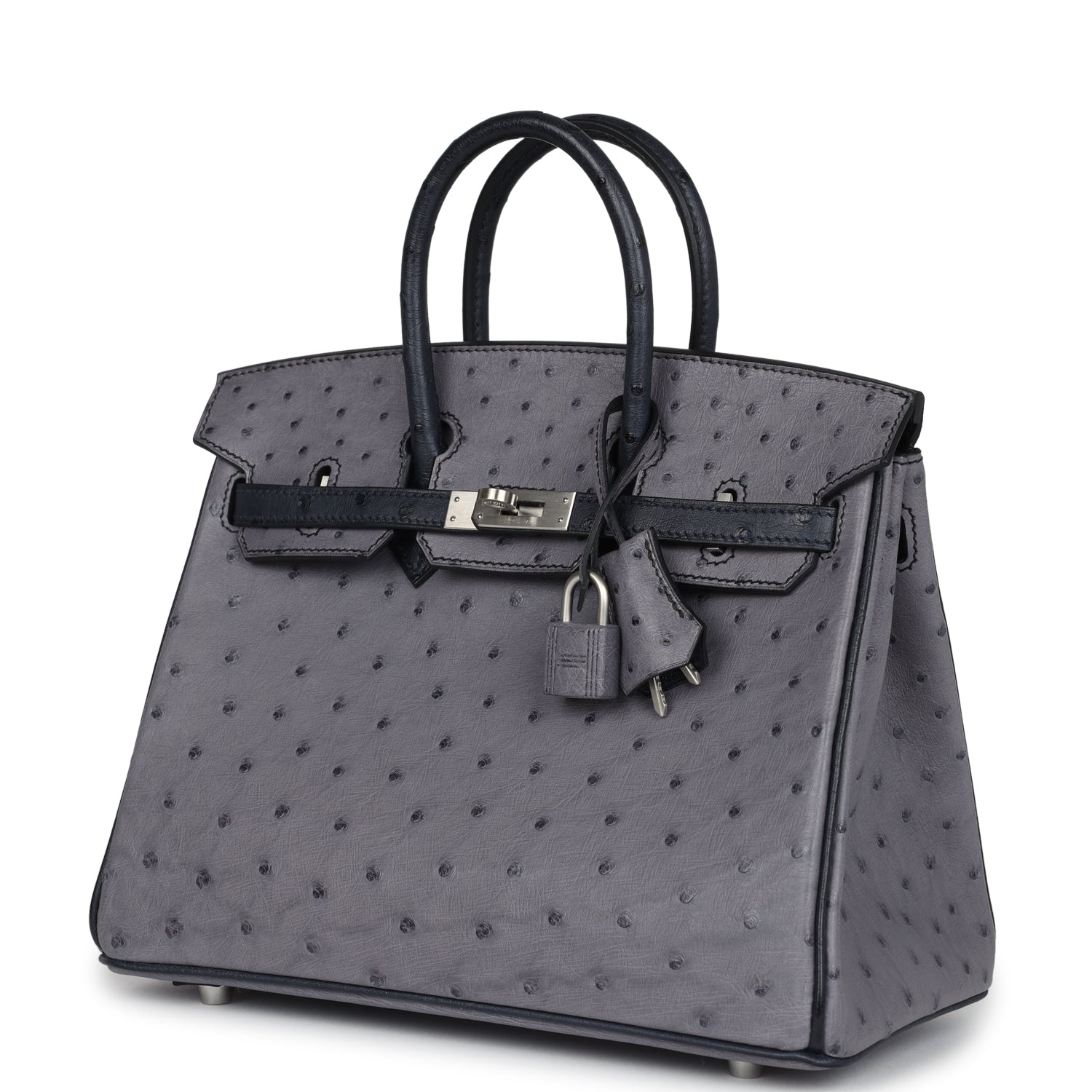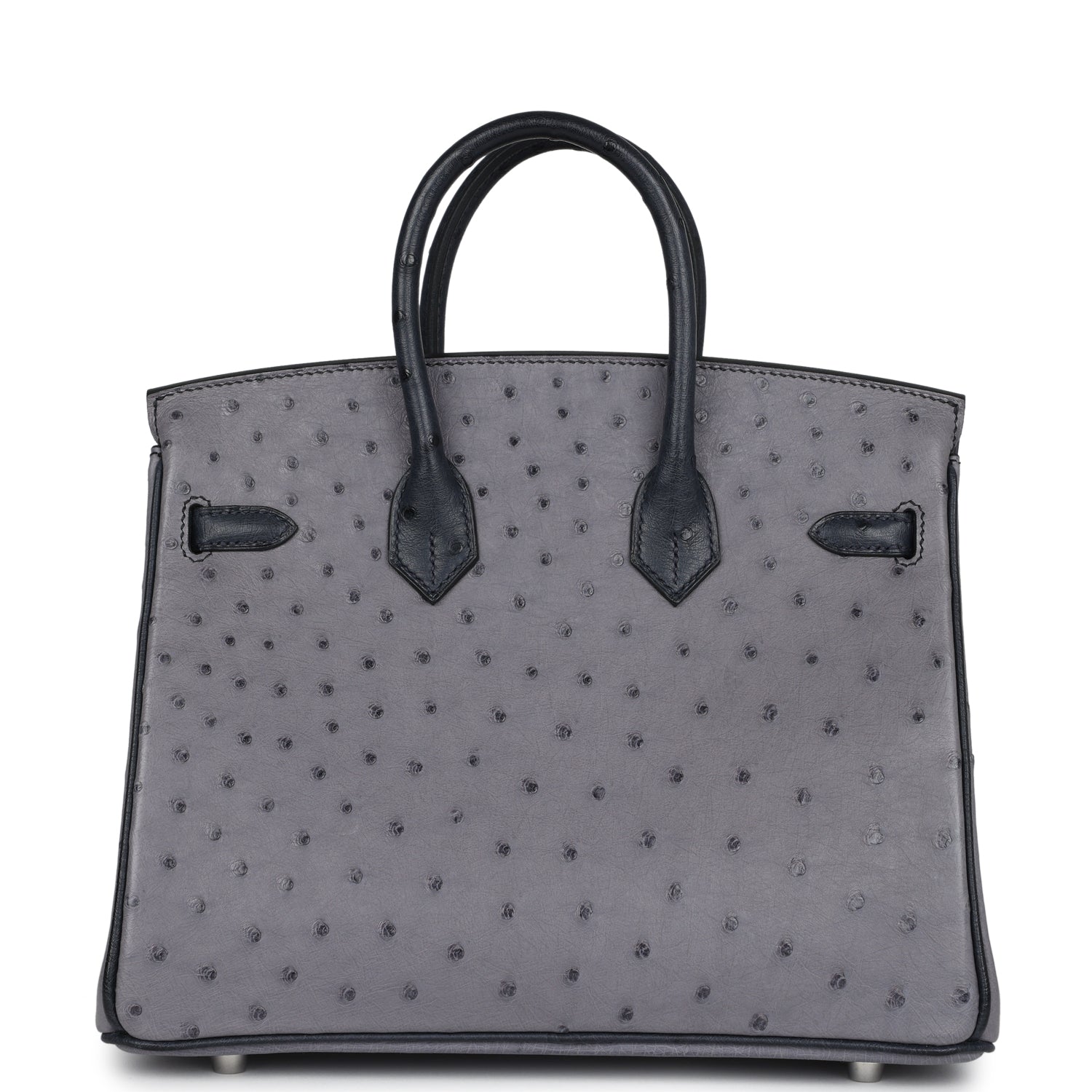 Pre-owned Hermes Special Order (HSS) Birkin 25 Gris Agate and Bleu Indigo Ostrich Brushed Palladium Hardware