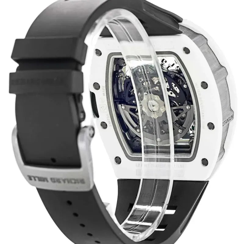 The RM 030 LMC displays the colors of the historic race inside of its movement as well as its white ATZ ceramic case and with the rubber of the NTPT crown.