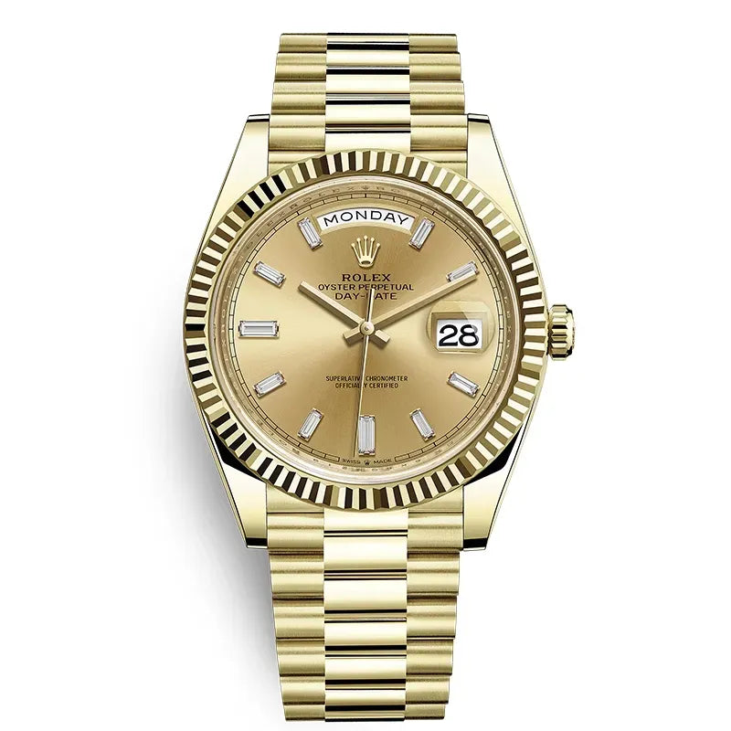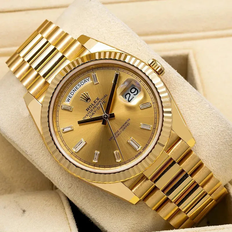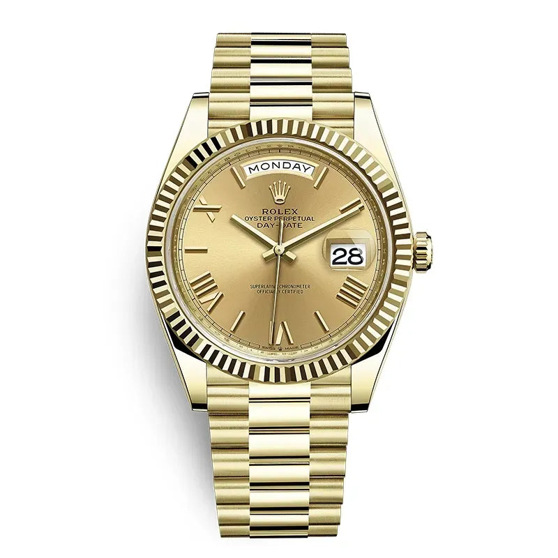 The Rolex fluted bezel is a mark of distinction. Originally, the fluting of the Oyster bezel had a functional purpose: it served to screw the bezel onto the case helping to ensure the waterproofness of the watch. It was therefore identical to the fluting on the case back, which was also screwed onto the case for waterproofness, using specific Rolex tools. Over time, the fluting became an aesthetic element, a genuine Rolex signature feature. Today the fluted bezel is a mark of distinction, in gold on this Day-Date 40.