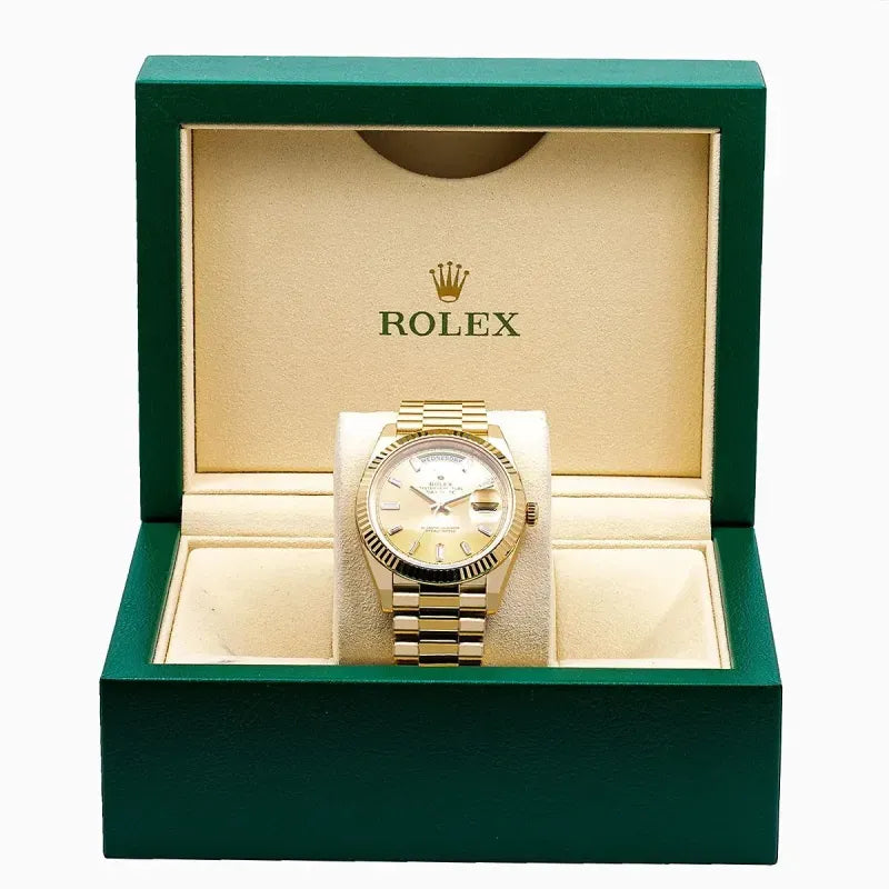 THE OYSTER PERPETUAL DAY-DATE 40 IN 18 KT YELLOW GOLD WITH A CHAMPAGNE-COLOUR DIAL, FLUTED BEZEL AND A PRESIDENT BRACELET.
