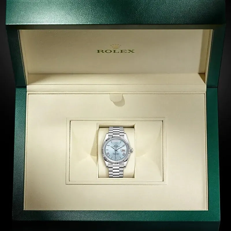 The dawn of a new day. The platinum Day-Date 40 featuring an ice-blue dial with faceted Roman numerals, fluted bezel, and fitted with the President bracelet.