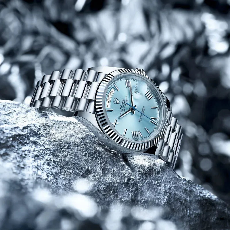 The ice-blue dial is the discreet and exclusive signature of a Rolex platinum watch. Rolex uses platinum, the noblest of metals, for the finest of watches. These exclusive dials can be found only on the Day-Date and the Cosmograph Daytona.