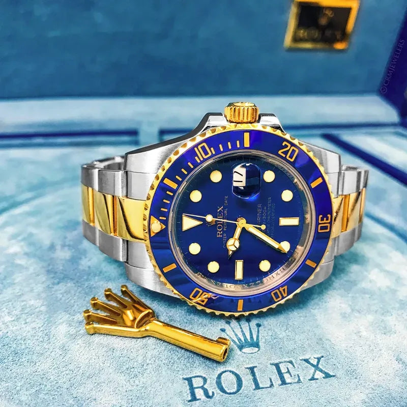 Oyster Perpetual Submariner Calendar watch in gold and Oystersteel models, with a royal blue dial and extra-large luminous hour markers.