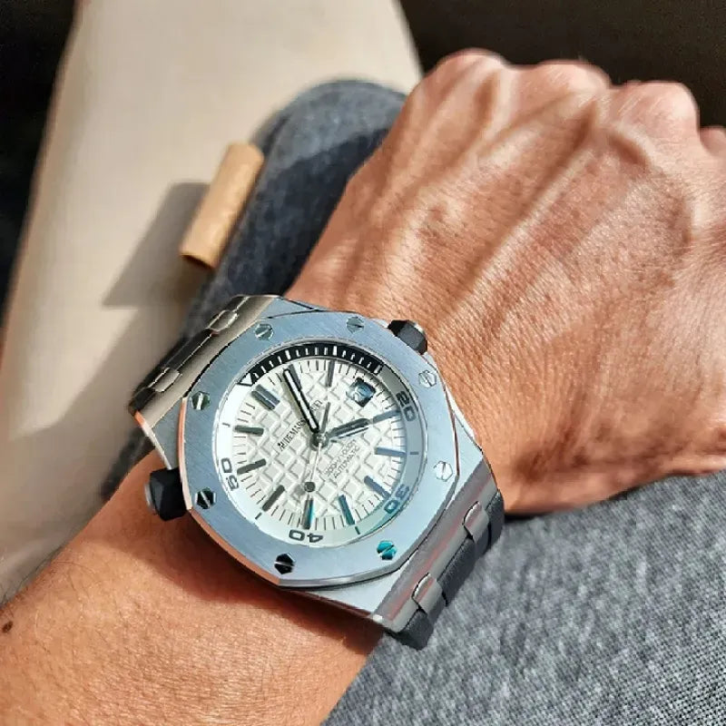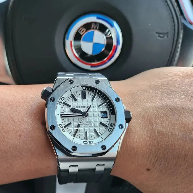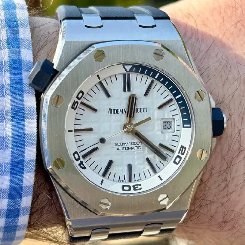 The white dial is engraved with "Méga Tapisserie" oversized plaid decoration, with white gold fluorescent three-dimensional hour markers and Royal Oak hands, and the white rotating inner bezel with diving scale and blue 15-minute scale display.