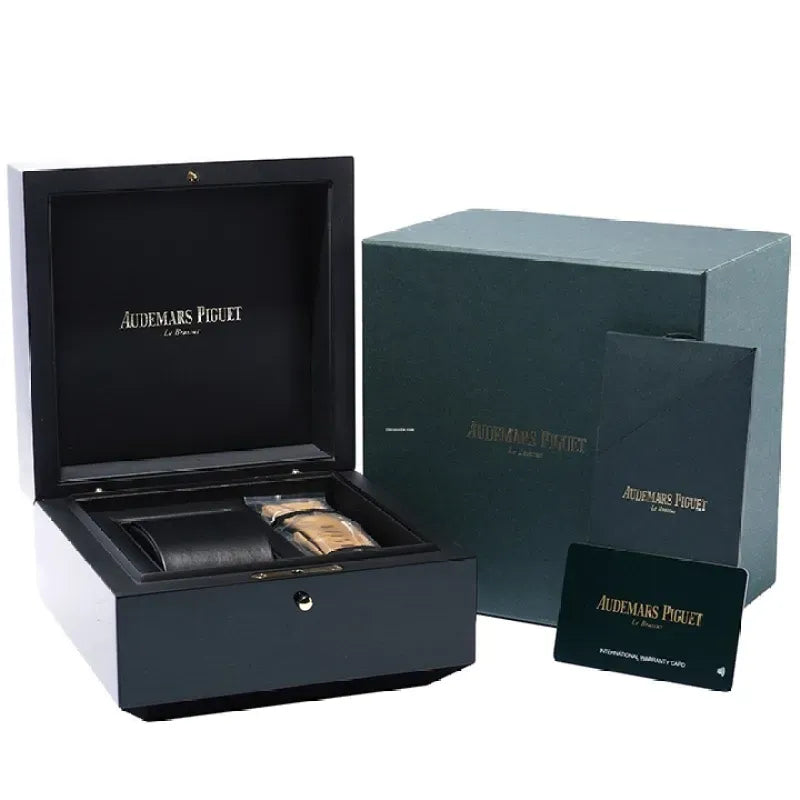Black dial with “Méga Tapisserie” pattern, pink gold applied hour-markers and Royal Oak hands with luminescent coating, black rotating inner bezel. with zone from 60 to 15 minutes in beige.