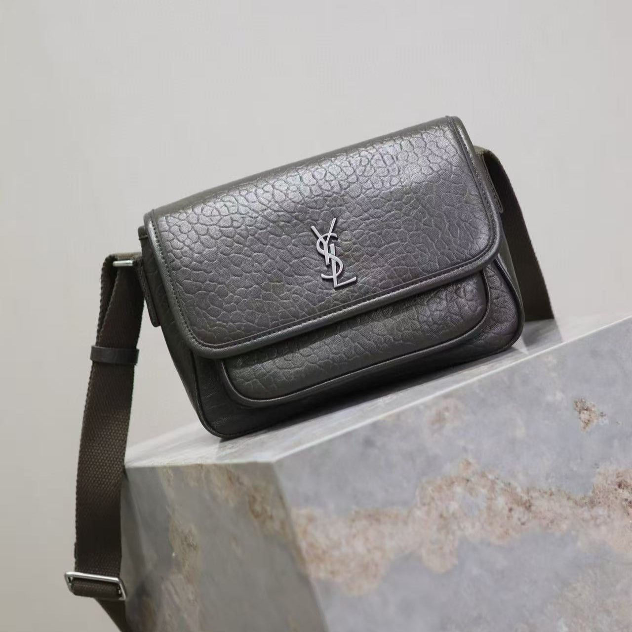 Saint Laurent Niki Logo Plaque Messenger Bag Dark Green Calfskin