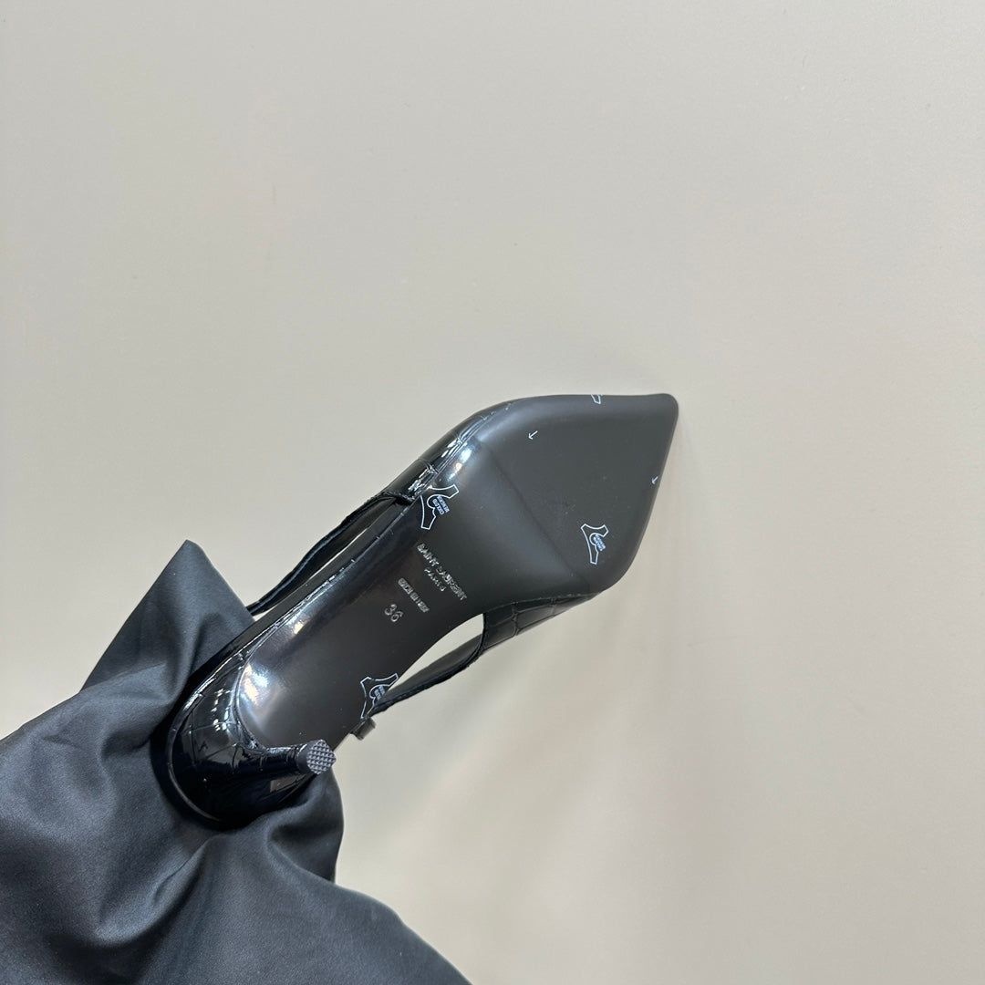 SL TRAPEZE CROCODILE MOTIF SLINGBACK PUMP BLACK CALFSKIN