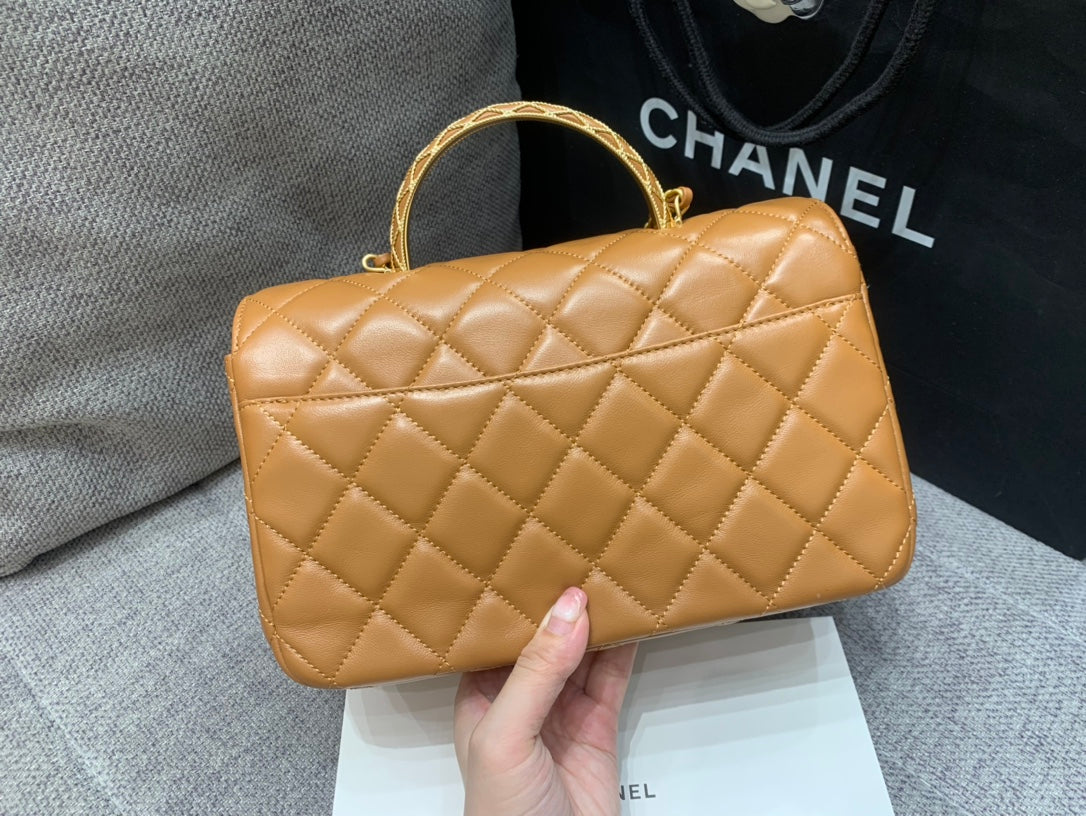 SMALL FLAP BAG 24CM TOP HANDLE BROWN LAMBSKIN GOLD HARDWARE