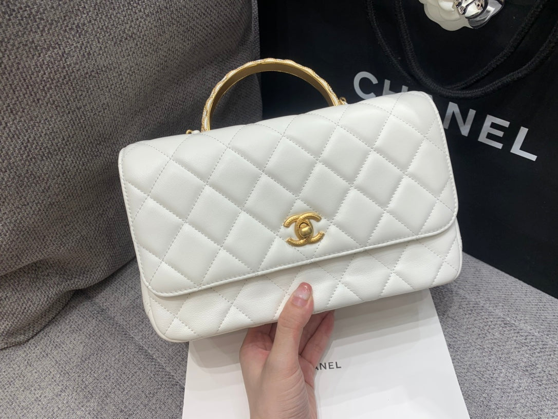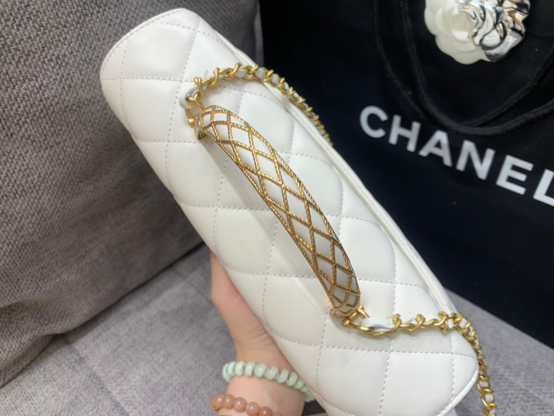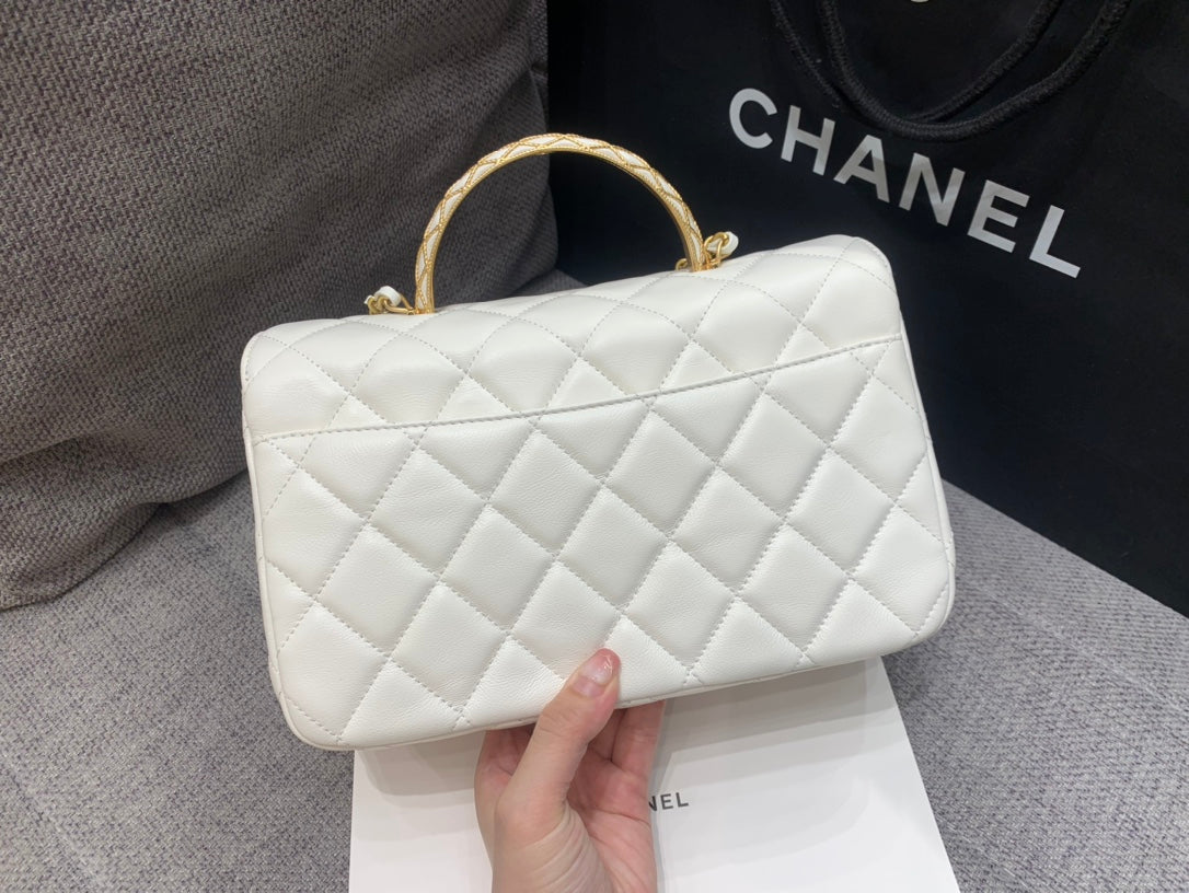 SMALL FLAP BAG 24CM TOP HANDLE WHITE LAMBSKIN GOLD HARDWARE