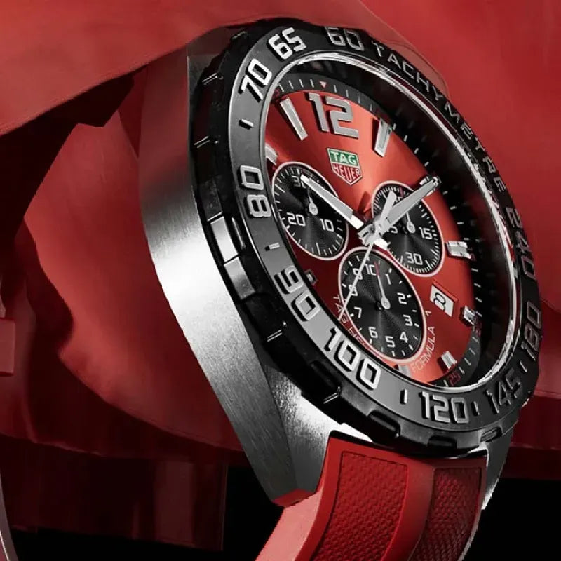 With an unmistakable vivid red sunray brushed dial and matching rubber strap, this fast-moving chronograph is ready to roar ahead in style.