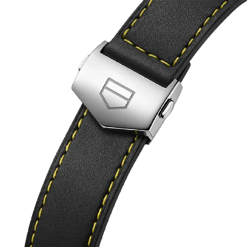 The black calfskin strap has a black lining lined with Senna yellow stitching and an exclusive embossed "S" pattern. The steel folding clasp has a double safety system and a pilot extension for wearing over a driving suit.
