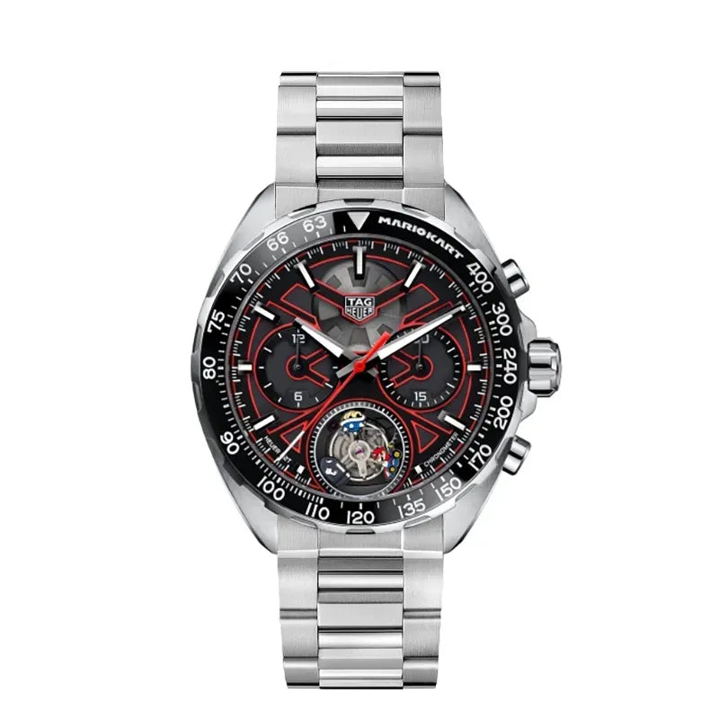 TAG Mario Kart joint limited tourbillon chronograph limited to 250 pieces. The unique 45mm case is crafted from grade 5 titanium, exuding a high-performance yet sophisticated aesthetic. The crown and chronograph pushers are made of fine-grained stainless steel; the screw-in case back is also made of grade 5 titanium, with a custom sapphire glass embossed with the Mario Kart logo.