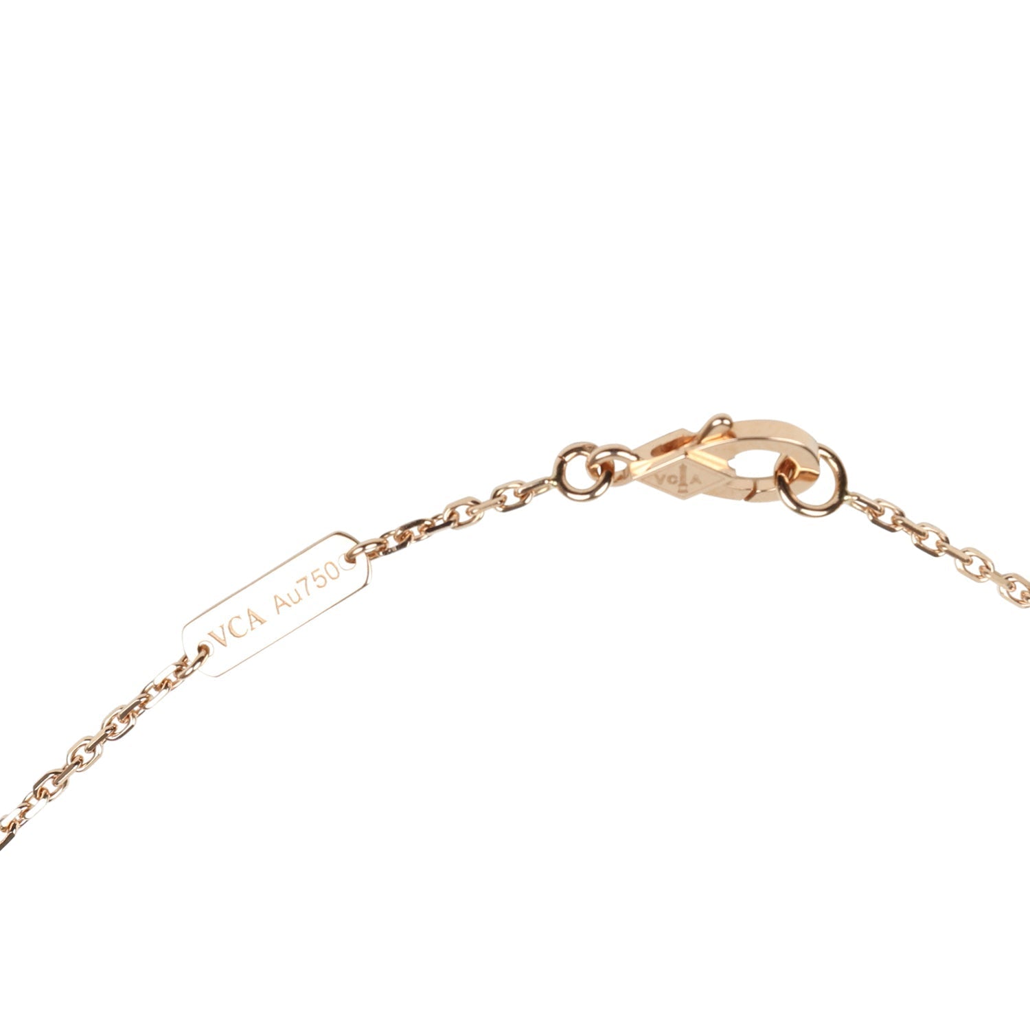 This Van Cleef & Arpels 2023 Holiday Alhambra Pendant Necklace, inlaid with Silver Obsidian Porcelain, with a .5 cart White Diamond in the center, made out of 18k Rose Gold, has a hallmark lobster clasp.