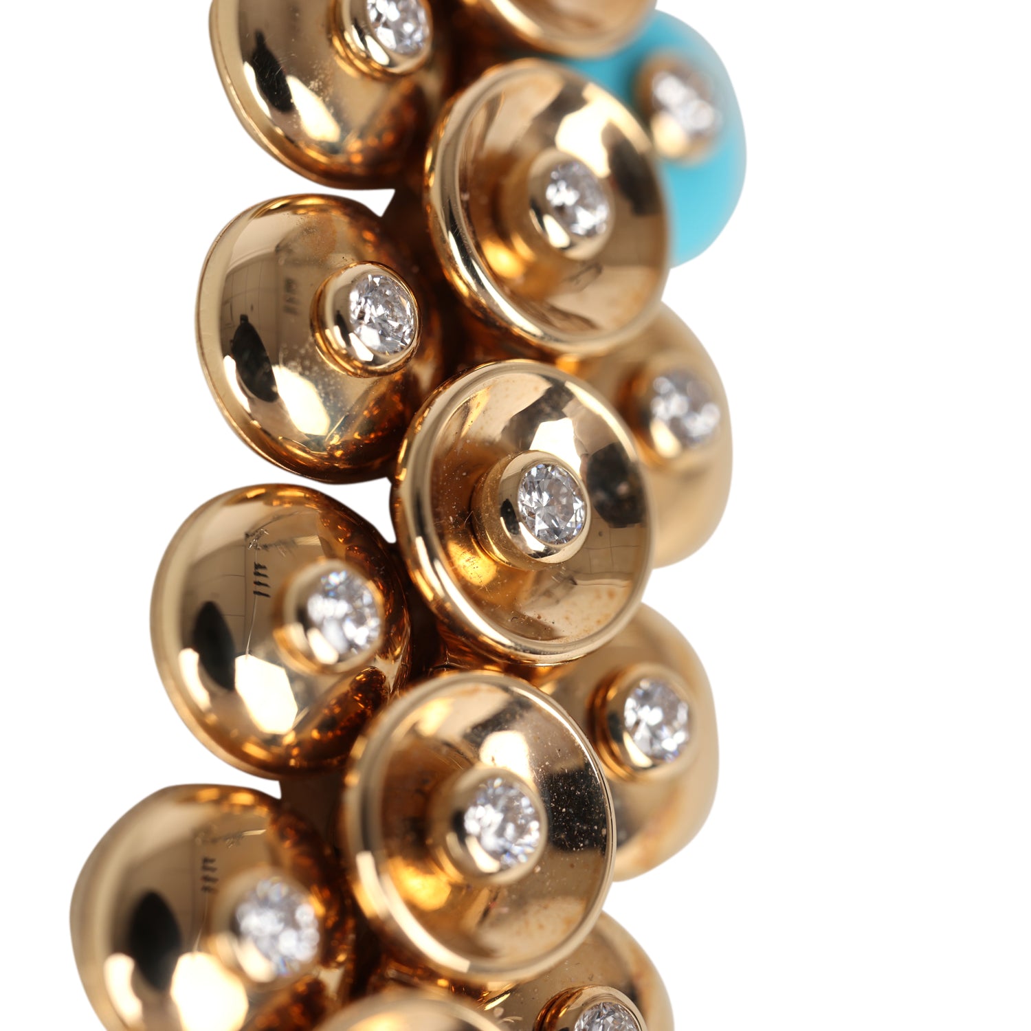 This Bouton D’Or Necklace is in turquoise and lapis lazuli with 18K yellow gold hardware and set with diamonds and has a a blade clasp and lever lock closure. It features 51 lapis lazuli stones, 30 turquoise stones and set with over 186 round cut diamonds totaling 5.55 carats.