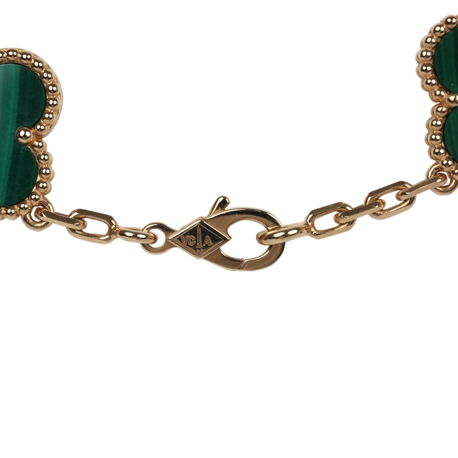 This Van Cleef & Arpels Vintage Alhambra 10 Motif necklace is in 18k yellow gold with 10 malachite motifs and a lobster claw clasp.
