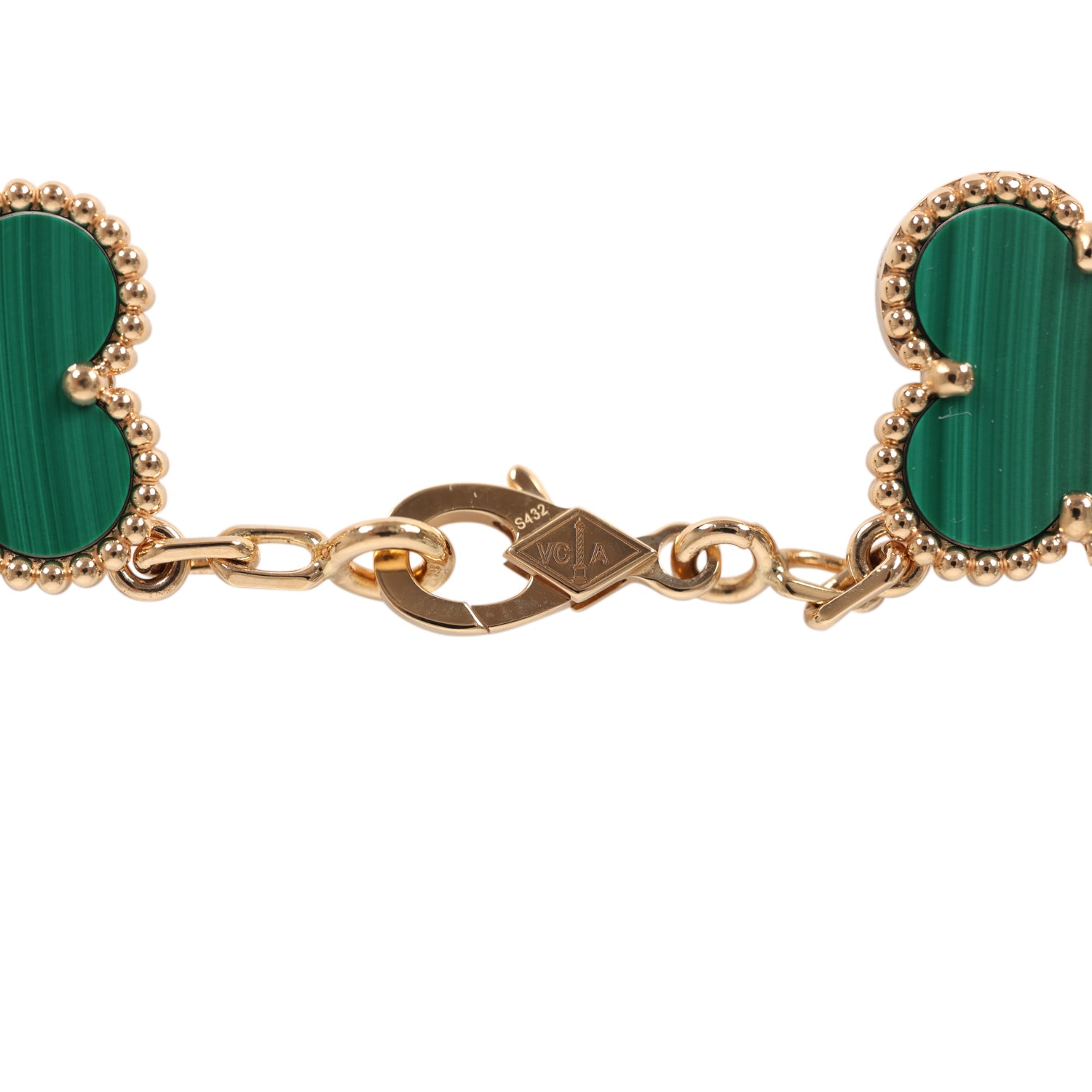 This Van Cleef & Arpels Vintage Alhambra 5 Motif Bracelet is in Malachite, featuring five Malachite clover motifs, set in 18k yellow gold hardware with a hallmark lobster clasp closure.
