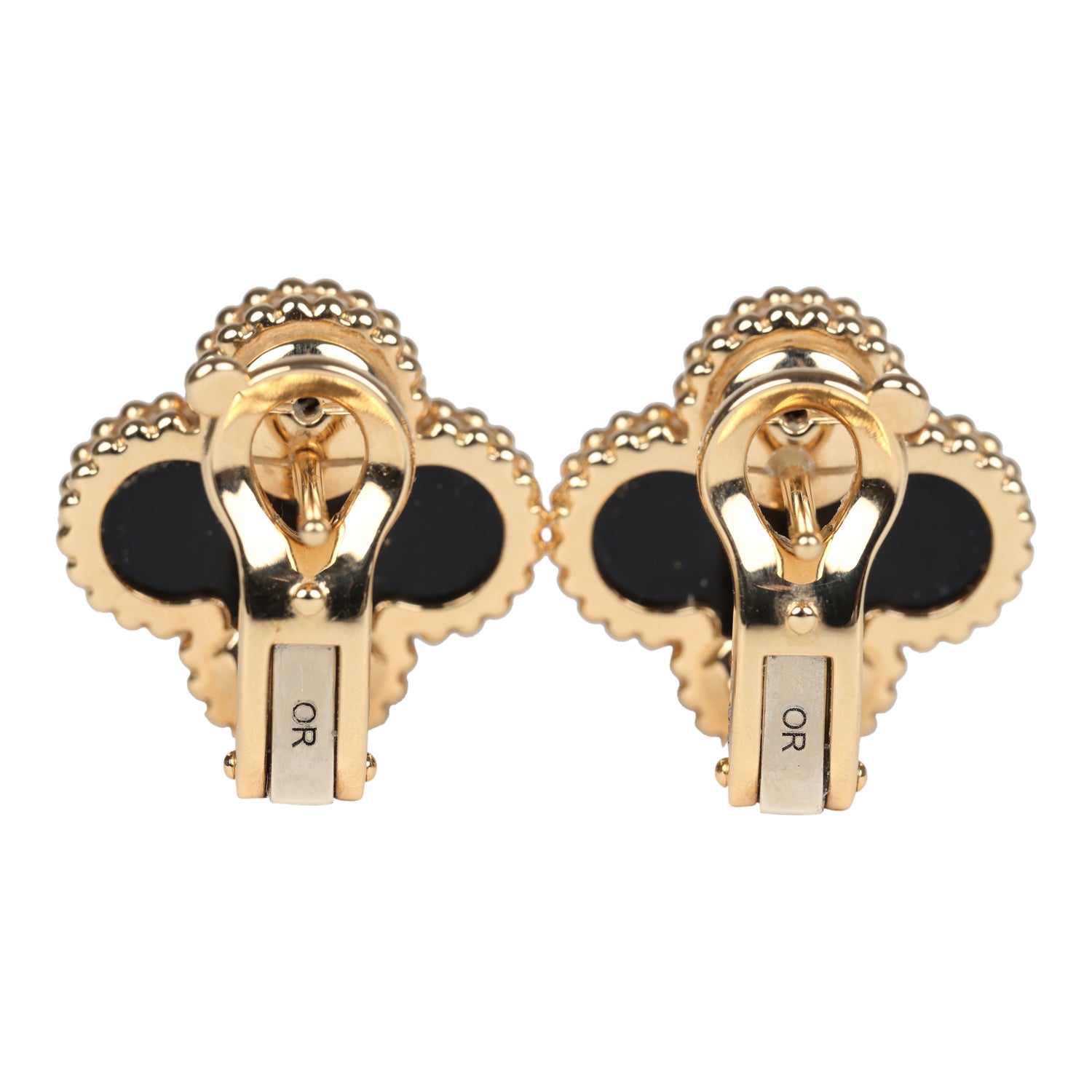These Van Cleef & Arpels Vintage Alhambra earrings are in Onyx and 18K yellow gold with a clip back closure with detachable stem.