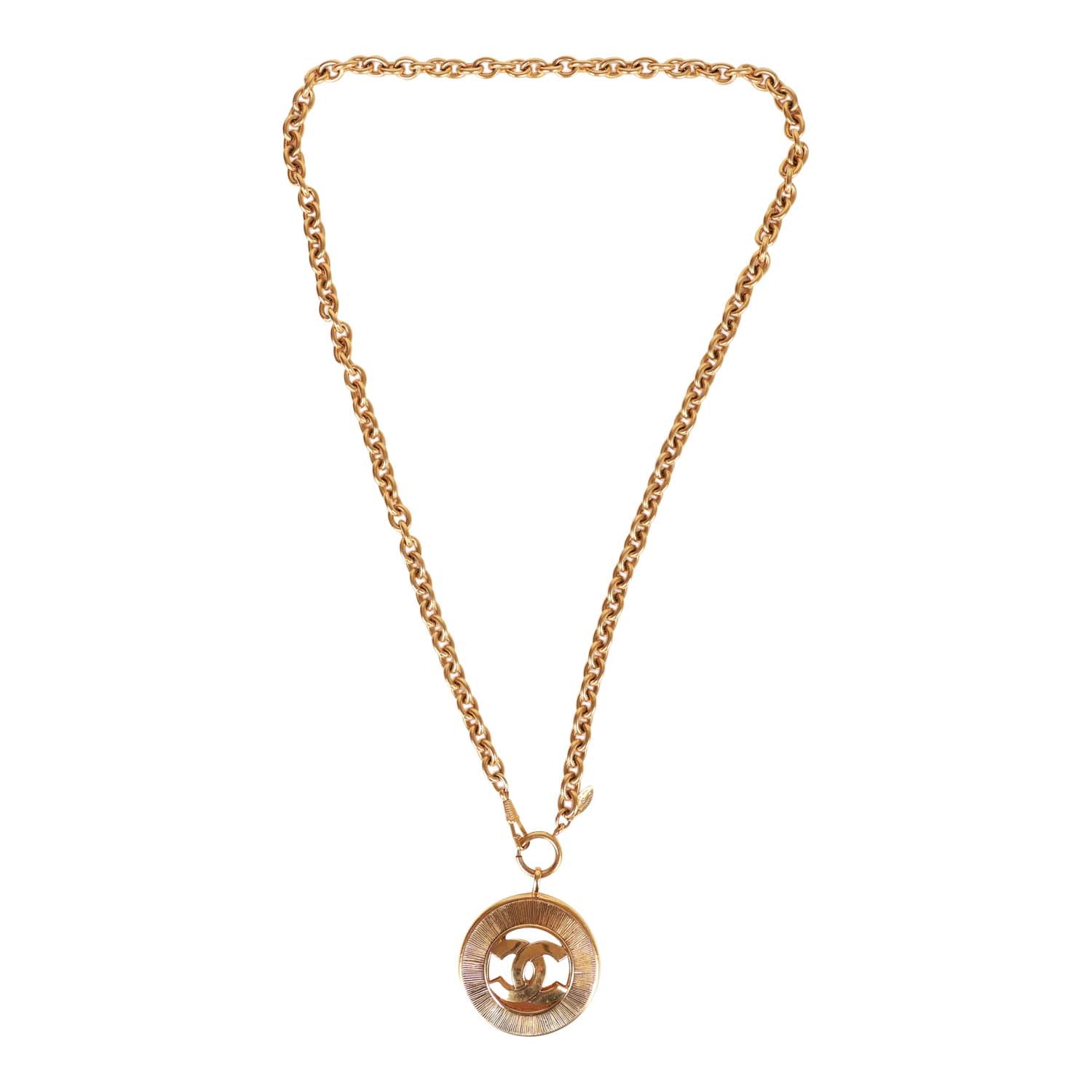 This vintage 1980's necklace features a large classic CC medallion with a sunburst design, long rolo chain and a springring/hook closure in 24K gold plated metal.