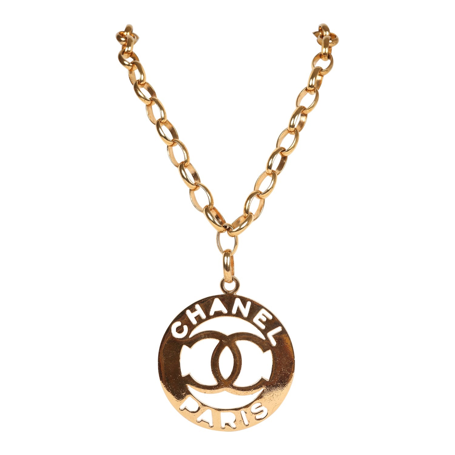 This Vintage Chanel CC Paris Jumbo Medallion is in 24K gold plated metal, "Chanel Paris" cut out on top and bottom, with the CC logo cut out in the center.