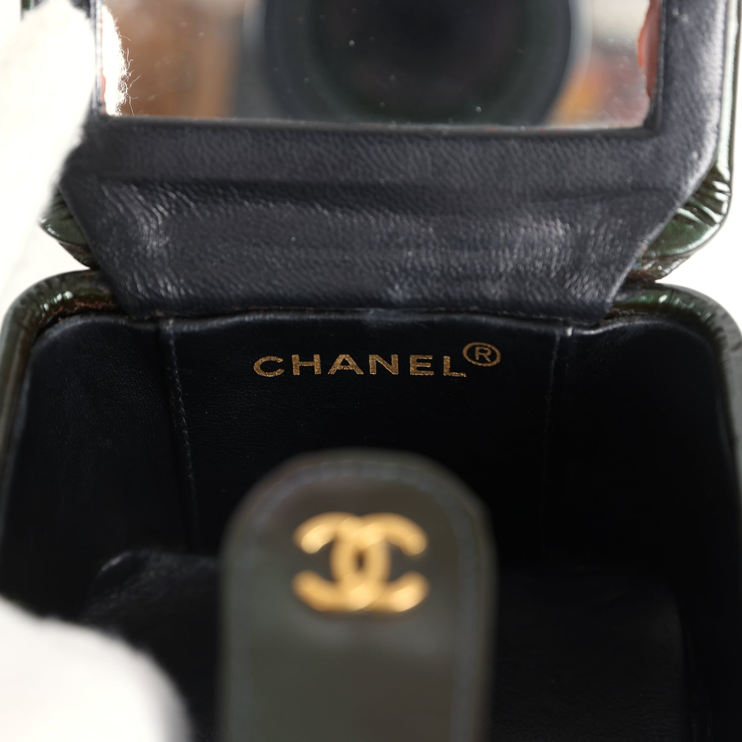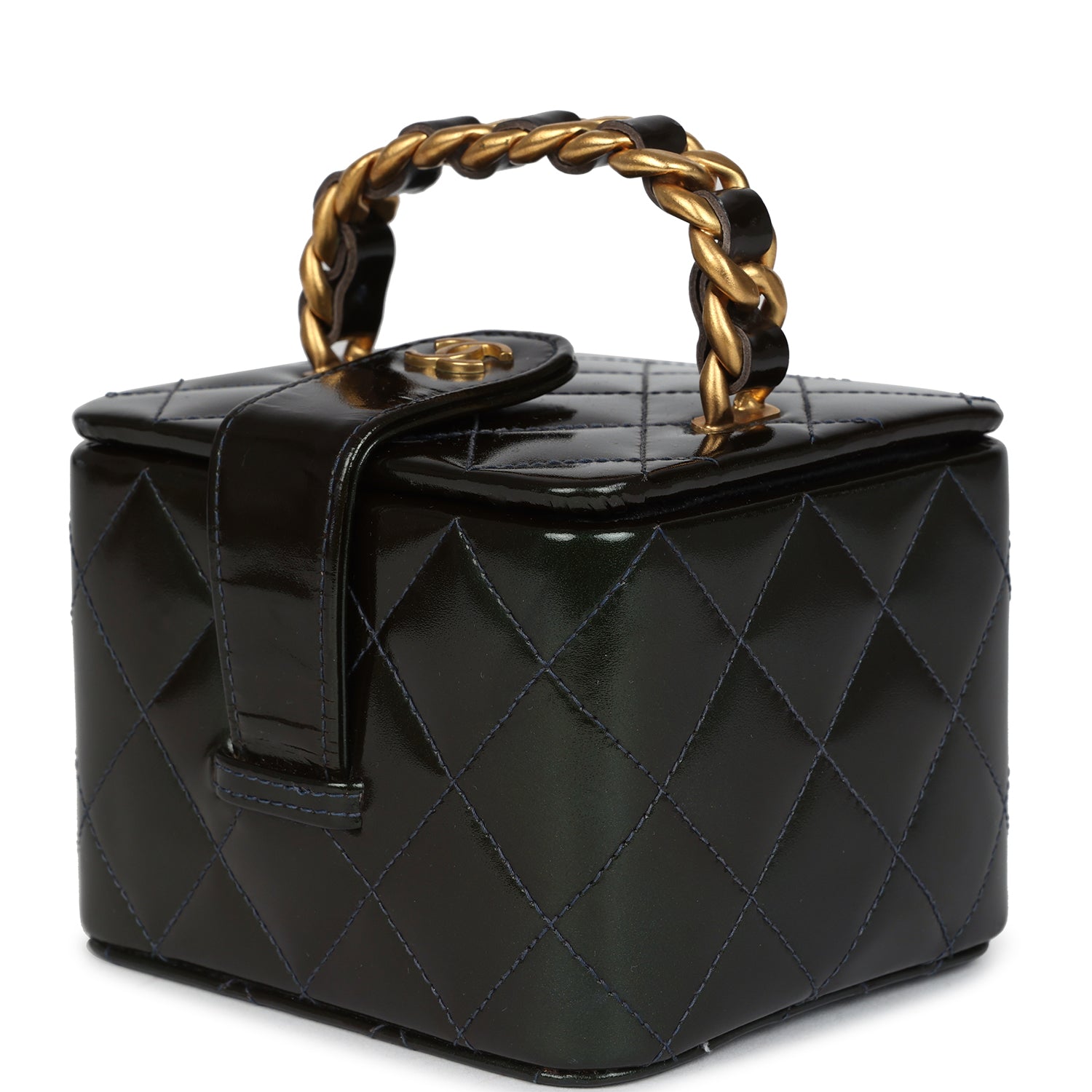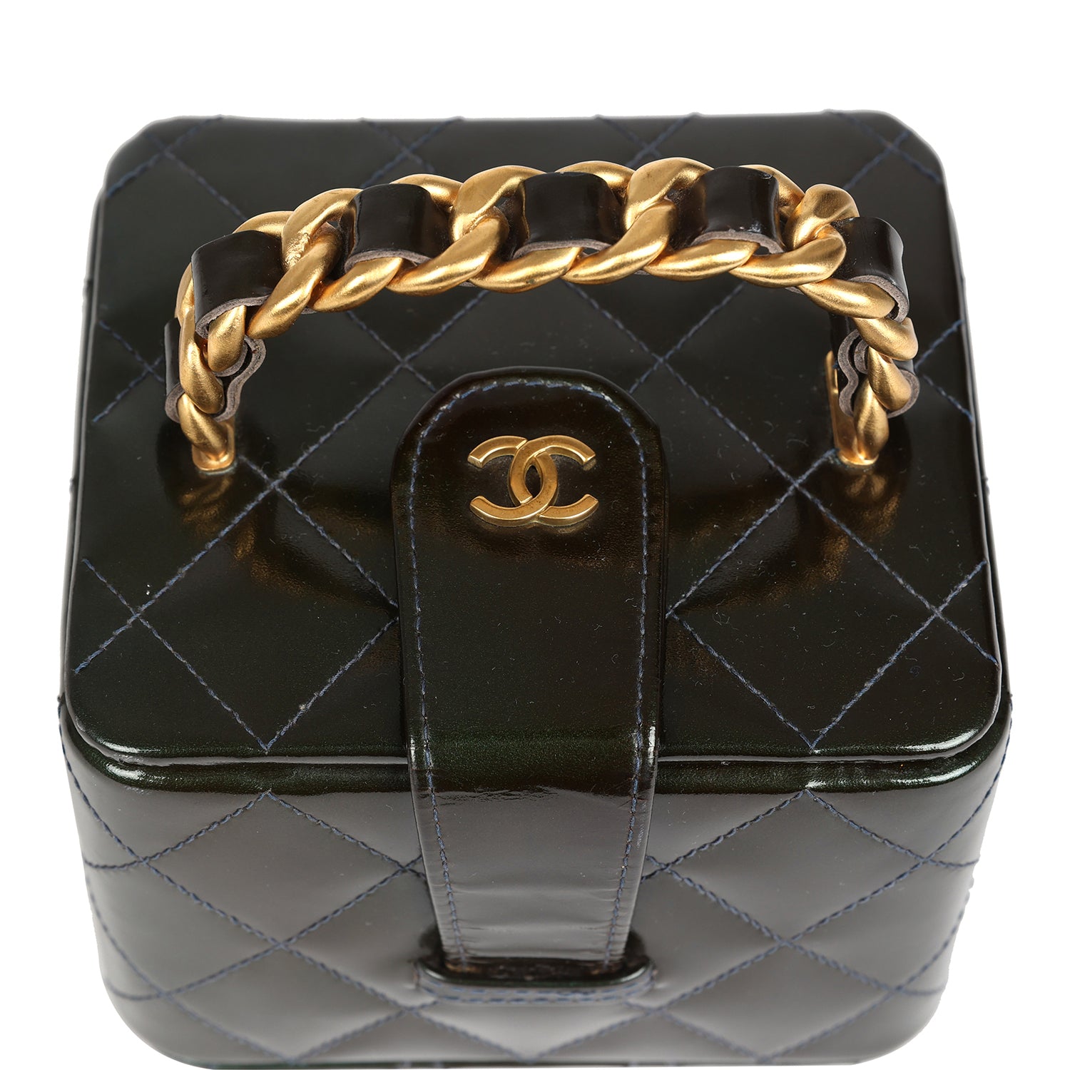 Vintage Chanel Mini Square Vanity Green Patent Antique Gold Hardware