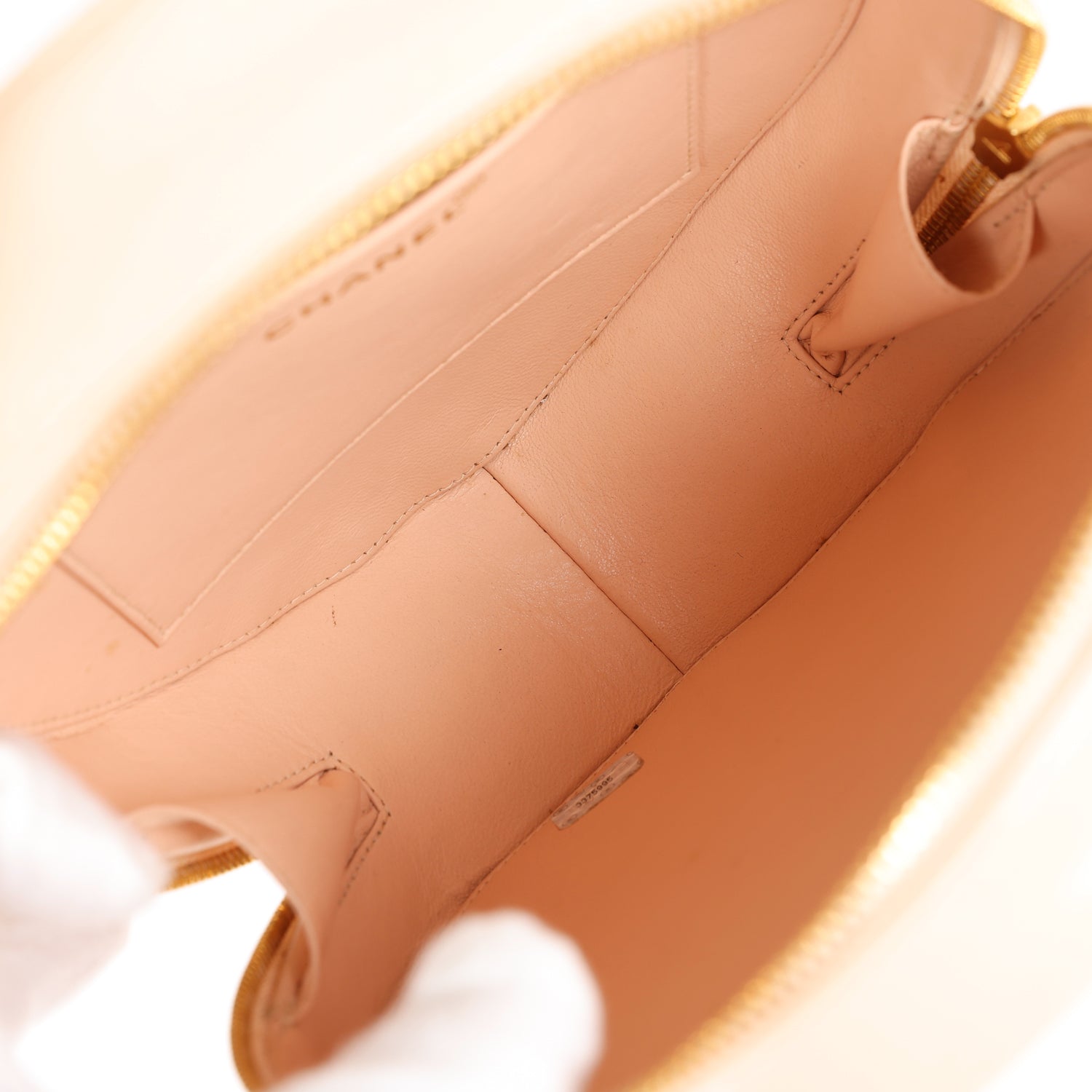 Vintage Chanel Round Vanity Bag Beige and Black Patent Leather Antique Gold Hardware