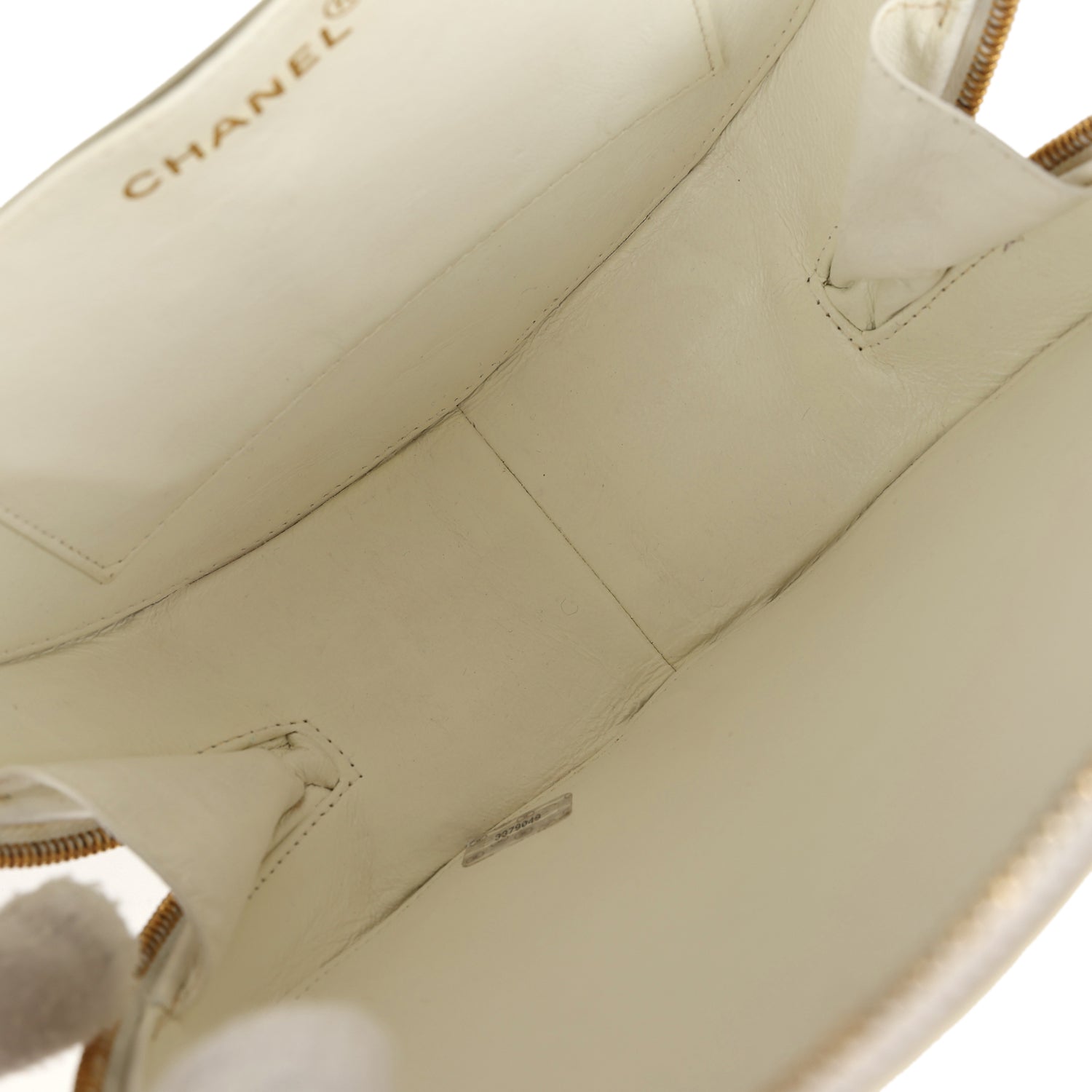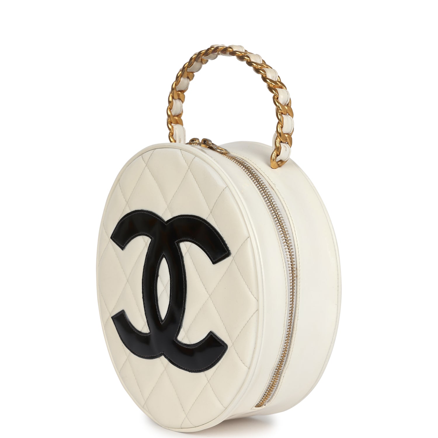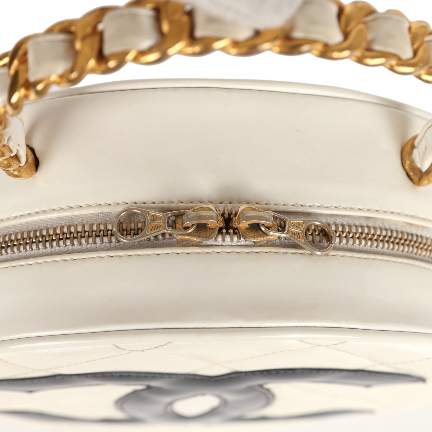 Vintage Chanel Round Vanity Bag White and Black Patent Leather Antique Gold Hardware