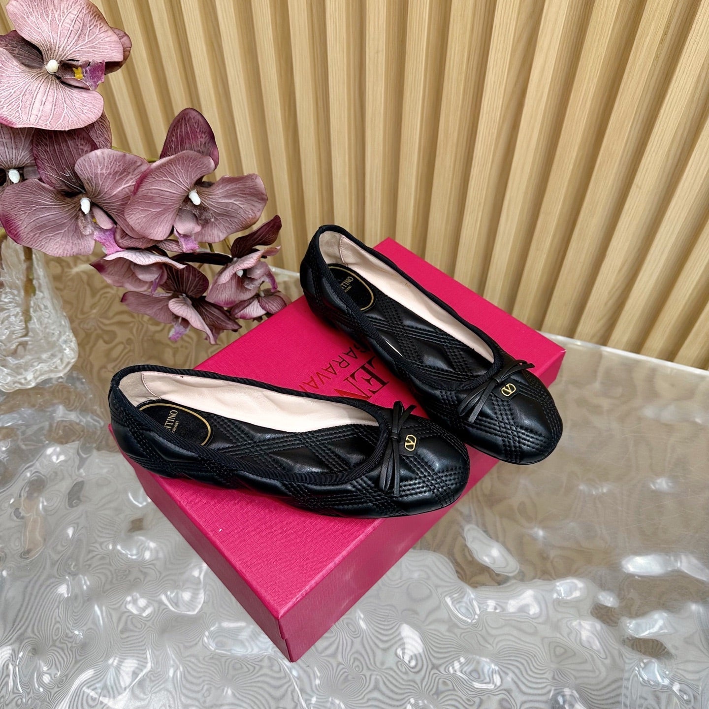 VT 2025 Quilted Leather Bow Ballerina Flats Black Sheepskin 286493