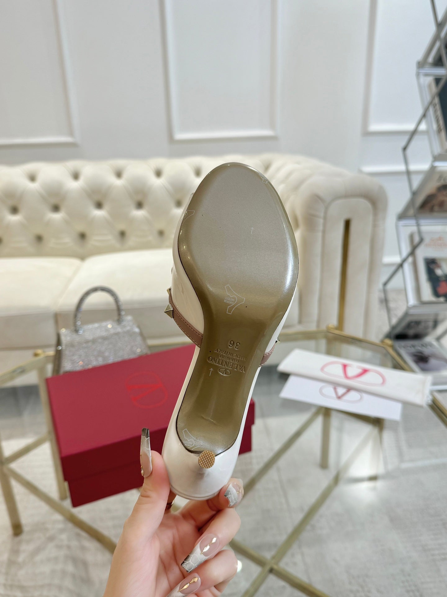 VT 25 Rockstud Bow Mule White Patent Leather